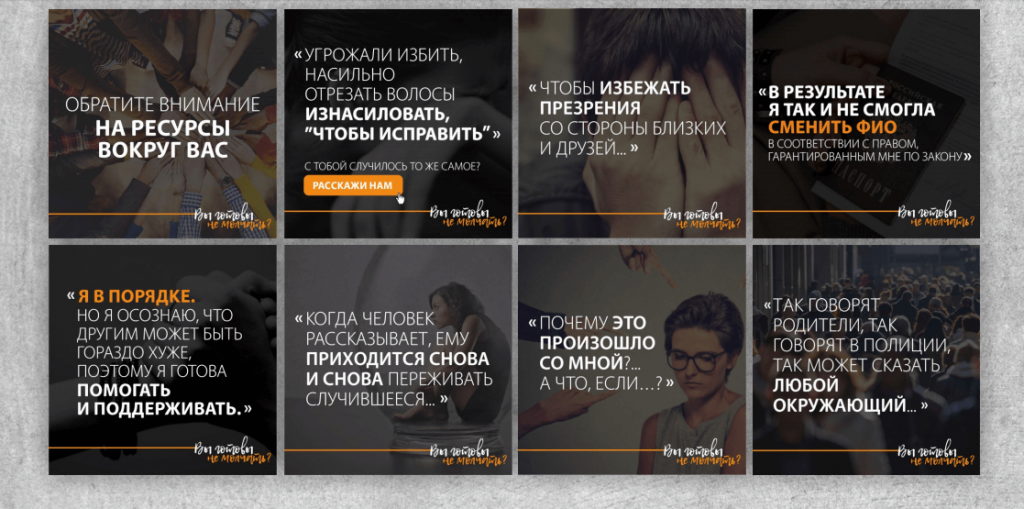 2. «Вы готовы не молчать?» (Екатеринбург). Проект ресурсного центра для ЛГБТИ. Активисты собирают информацию о случаях нарушения прав по признаку сексуальной ориентации и гендерной идентичности в Свердловской области. У центра есть фирменная продукция: открытки, листовки с призывали поделиться историей, постеры для социальных сетей, информационные брошюры.