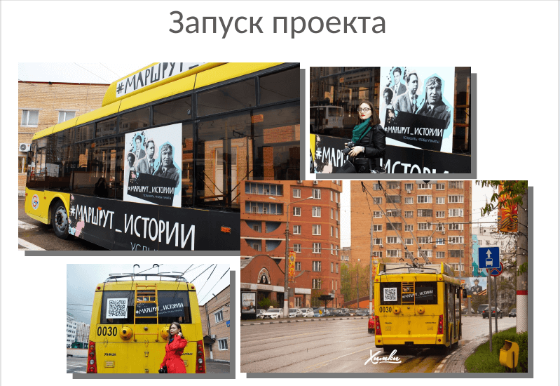 1. Троллейбус «Маршрут истории» (Подмосковье). 9 мая 2017 года, в День победы, в Химках был запущен тематический троллейбус. В нем работала аудиоэкскурсия: пассажиры могли узнать в честь кого названы улицы, скверы и памятники. Также вся информация была собрана авторами проекта и размещена на специальных стикерах с QR-кодами. Авторы идеи: студенты академии гражданской защиты МЧС России Мария Максимова и Алина Герман.