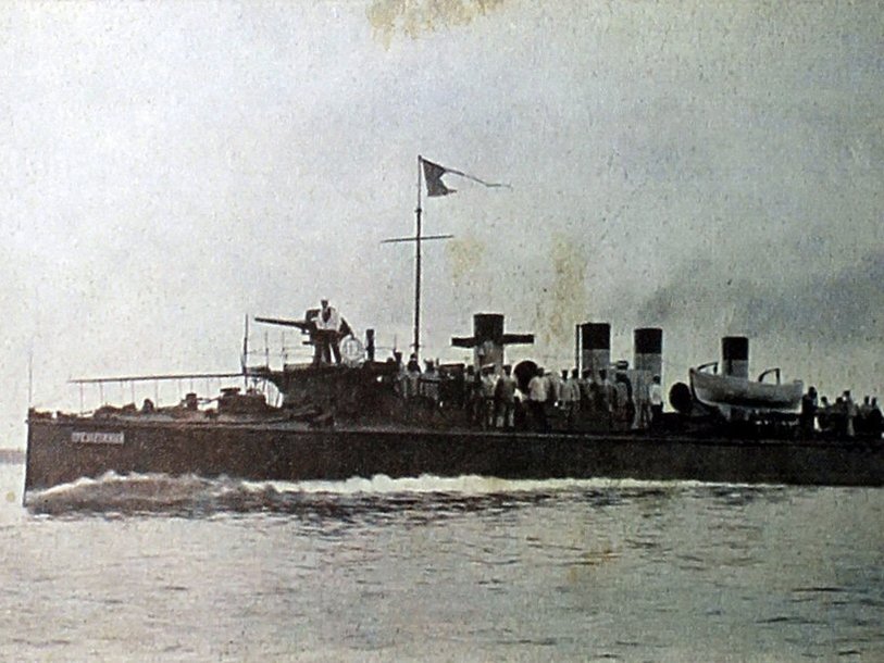 Эсминец «Стерегущий» погиб во время русско-японской войны, 26 февраля (10 марта) 1904 года, недалеко от Порт-Артура. В тот день три эсминца возвращались в Порт-Артур после ночной разведки, но неожиданно встретились с шестью японскими кораблями. Прорваться в порт удалось не всем, от первых выстрелов японских орудий паровая машина «Стерегущего» получила серьезные повреждения, поэтому он был вынужден, оставаясь на месте, принять неравный бой. В ходе яростного обстрела эсминец получил множество пробоин, из 48 человек экипажа 44 погибли в бою. Японцы намеревались взять корабль на буксир, чтобы захватить его, но «Стерегущий» вскоре затонул.