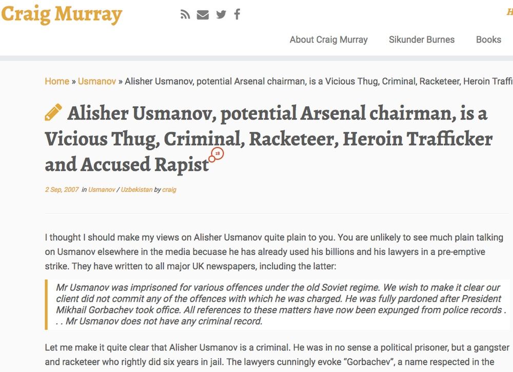 Усманов и правда не стал обращаться в британский суд с иском против Мюррея. Его представители добились, чтобы лондонский провайдер бывшего посла заблокировал его блог. Мюррей говорил The Times, что, по его мнению, Усманов испугался подавать в суд, потому что во время процесса могли всплыть нелицеприятные факты из его биографии.