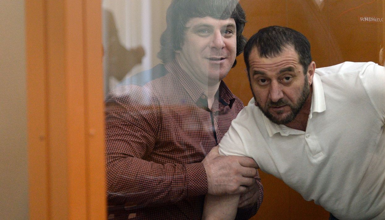 В зале суда обвиняемые Заур Дадаев и Хамзат Бахаев (еще трое — братья Шадид Губашев и Анзор Губашев, а также Темирлан Эскерханов — удалены из зала из-за препирательств с судьей; они появятся, чтобы сказать последнее слово) что-то весело обсуждали через клетку с защитниками.