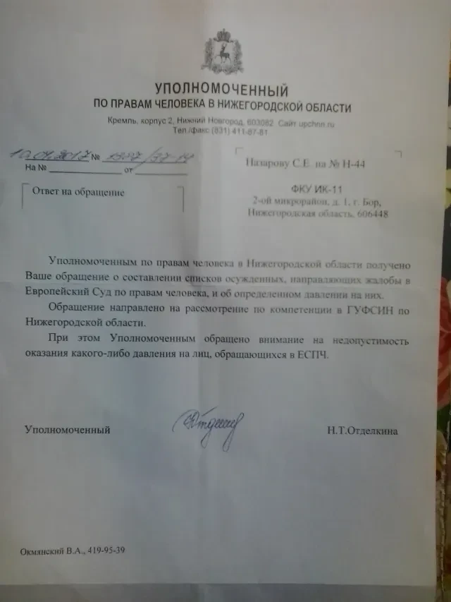 Назаров по факту составления этих незаконных списков направил жалобу уполномоченному по правам человека по Нижегородской области Отделкиной. Но получил от нее отписку, что «обращение направлено на рассмотрение по компетенции в ГУФСИН по Нижегородской области». Назарова вызывал отрядник восьмого отряда, кричал на него: «Чего ты жалуешься?»