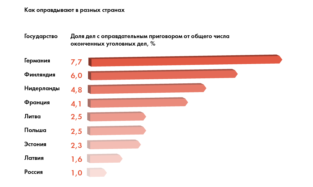 Почему так происходит в России и в других странах бывшего СССР? Почему у нас профессиональные судьи оправдывают 0,2% (а если учитывать дела без прокурора — ближе к 1%), в то время как в Восточной Европе — порядка 2%, а в среднем по Европе — 5-6%?
