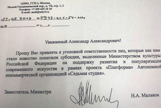 В письме Малаков просит «привлечь к уголовной ответственности лиц, которые, как нам стало известно, похитили субсидии, выделенные Министерством культуры Российской Федерации на поддежку развития и популяризации современного искусства в рамках проекта "Платформа" Автономной некоммерческой организации "Седьмая студия"».