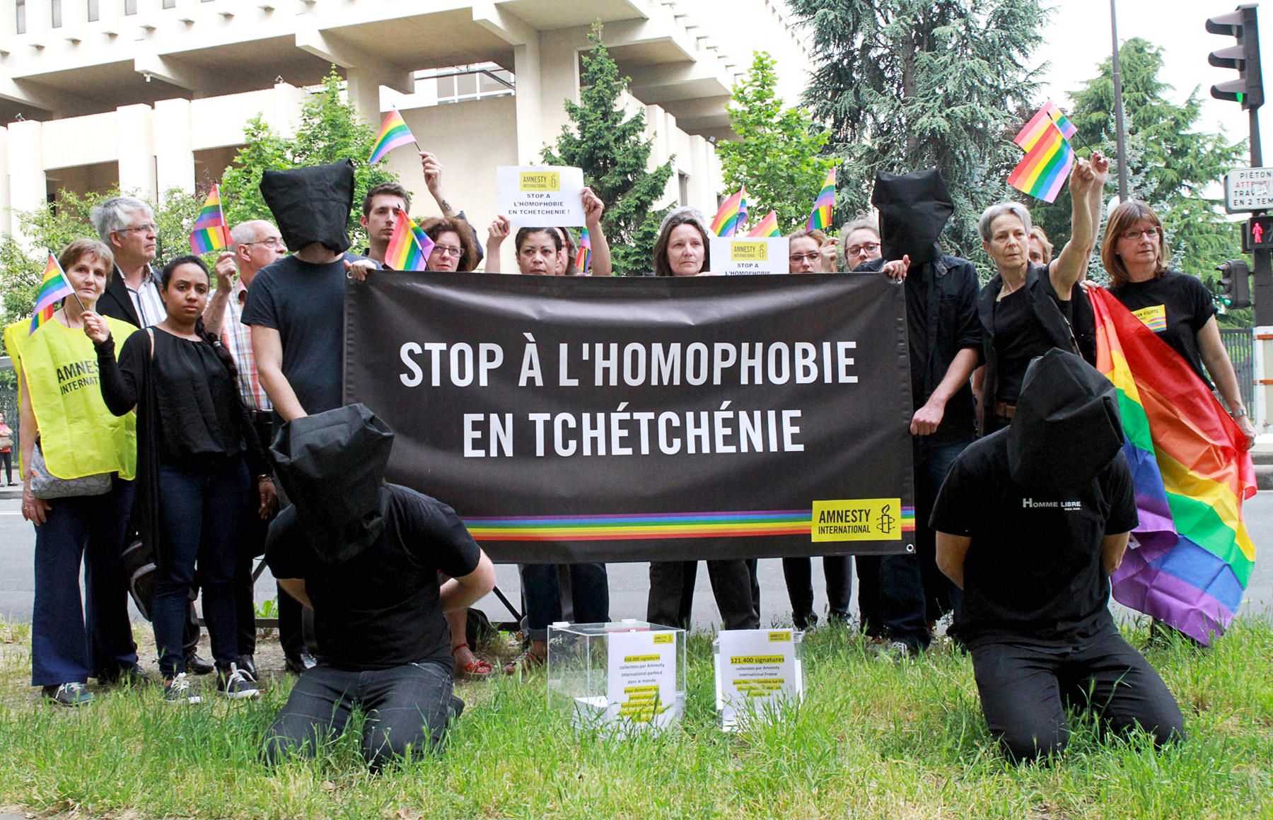 Human rights activists from Amnesty International staged a demonstration outside the Russian embassy in Paris on June 2, announcing a day of solidarity with gay people in Chechnya.