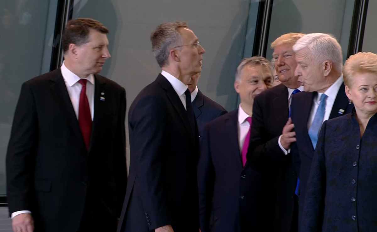 Тот неловкий для США момент, когда президент страны запросто отодвигает премьера Черногории (второй справа), чтобы самому оказаться в фокусе телекамер, Брюссель, 25 мая 2017 года