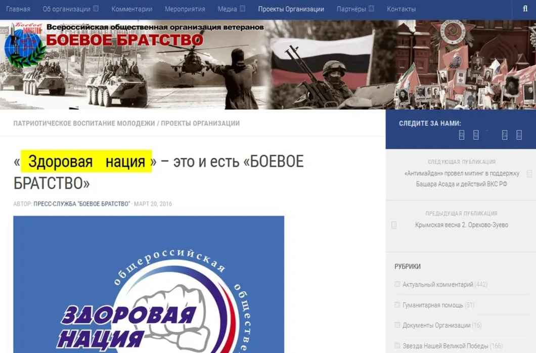До хованского побоища «Здоровая нация» позиционировала себя как молодежное крыло ветеранской организации «Боевое братство». И «Боевое братство» от «Здоровой нации» не открещивалось. Это уже после 14 мая 2016 года произошла зачистка сайта ветеранской организации, откуда были удалены все упоминания о «Здоровой нации». К примеру, интервью Георгия Макарьева с красноречивым названием «Здоровая нация» — это и есть «Боевое братство».