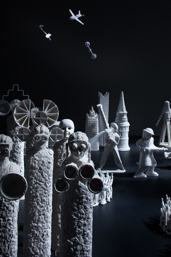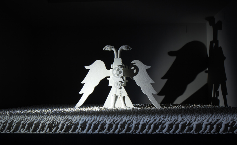 Надо сказать, что у выставки имеется и политический аспект, самим художником преподносимый как классическая постдиссидентская истина о тоталитарном государстве-машине и его гражданах-винтиках. Хотя двуглавый орел однозначно отсылает к современности, а в солдатах можно узнать государственных охранителей, сгоняемых в Москву в дни народных гуляний, считать что-то более артикулированное невозможно. Но даже в таком расфокусированном виде политика приводит к курьезам. Так, в комментарии куратора персонажи, те самые, скорее, солдаты или солдатики Брускина, неожиданно именуются «митингующими». Если продолжить логику Михайловского, то можно предположить, что орел выступает как бы охранителем культурных ценностей Родины от распада и деградации.