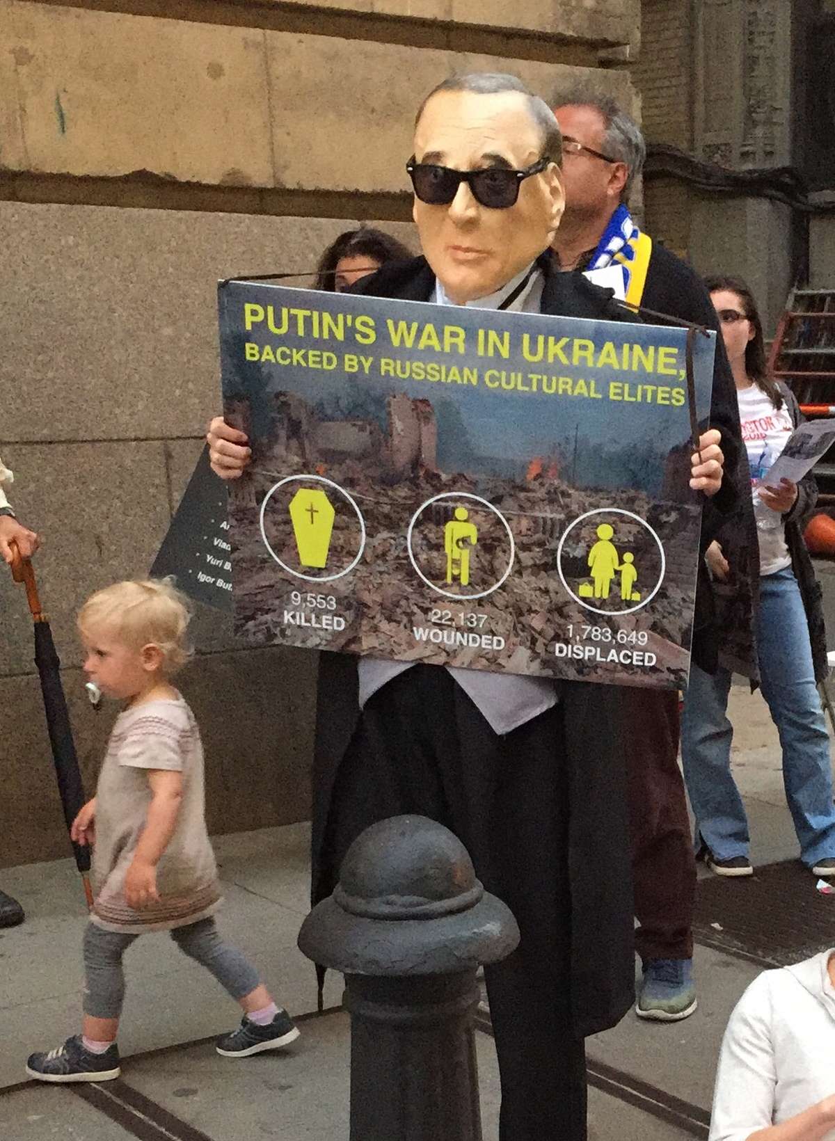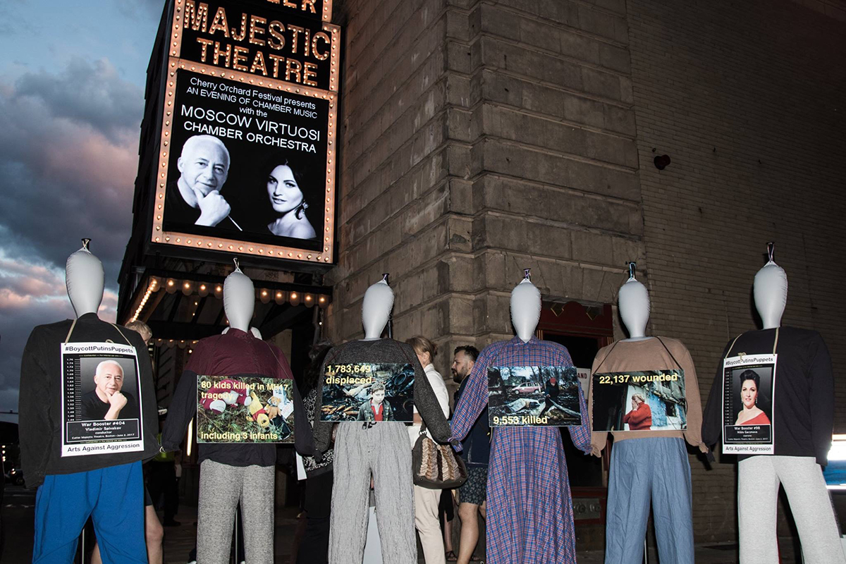 Статья была написана арт-репортером Малколмом Гаем (Malcolm Gay) и анонсировала сюрприз, который Владимиру Спивакову подготовили бостонские активисты из группы Arts Against Aggression. Прямо под дверями театра, где выступали российские исполнители, группа установила инсталляцию «Путин — дирижер войны», рассказывающую о последствиях политики Путина на Украине — той самой политики, которую столь горячо поддержала российская артистическая элита, политики, которая привела к десяткам тысяч убитых и раненых, миллионам беженцев.