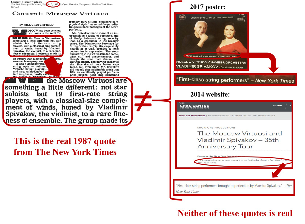 Это и неудивительно, ведь в Наблюдательный совет (Advisory Board) этой «американской» концертной организации входят сами Денис Мацуев, Владимир Спиваков и Хибла Герзмава. У себя на родине они активно поддерживают политику российских властей по отношению к Украине, а приезжая на запад, изображают из себя посланцев мира, при этом не стесняясь использовать сомнительные рекламные методы. К примеру, на всех афишах Спивакова и «Виртуозов Москвы» напечатана цитата из The New York Times, которая якобы назвала российский государственный оркестр «First-class string performers». Однако в поисковой базе данных, содержащей ссылки на все публикации этой газеты с 1923-го года, такой цитаты не содержится. Данная цитата, как показали дальнейшие архивные поиски, была скомпилирована из статьи, опубликованной в NYT еще в 1987 году. Идти на такие уловки пришлось, потому что во время юбилейного гастрольного тура «Виртуозов» по США в 2014 году не было рецензий музыкальных критиков — газеты писали только о протестах на концертах.