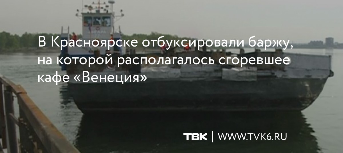 В Красноярске отбуксировали баржу, на которой располагалось сгоревшее кафе «Венеция»