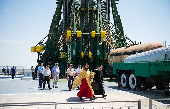 Ее настоятель отец Сергий — крупный мужчина с очень быстрой речью. Поверх рясы он носит черную форменную куртку с нашивками «духовник Роскосмоса» и своим именем. С 1998 года он освящает ракеты перед пуском и уже 17 лет благословляет космонавтов. По его словам, пока еще никто не отказывался. «Я составил специальный молитвенный чин, который был одобрен Святейшим Патриархом Алексием», — рассказывает священник. Обычно он произносит такую фразу: «благословляется и освящается корабль сей воздушный». По его словам, не освящал он только белорусский спутник «БелКа» и наш «Протон». Оба аппарата упали.