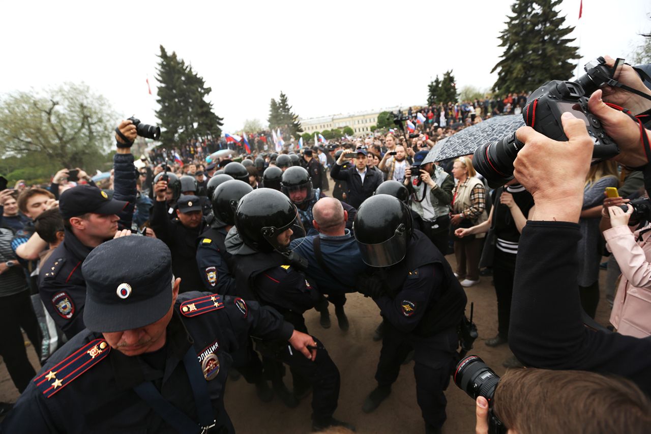Дальше все продолжалось примерно по одному сценарию. Митингующие в центре Марсова поля кричали: «Позор» и «Долой царя», а также «Жулики и воры, пять минут на сборы». В ответ на это ОМОН выстаивался в новое кольцо, внутри которого оказывались демонстранты, другие бойцы врывались в кольцо, выдергивая протестующих по одному. Тех, кто сопротивлялся, волокли по земле, к тем, кто шел спокойно, силу не применяли.