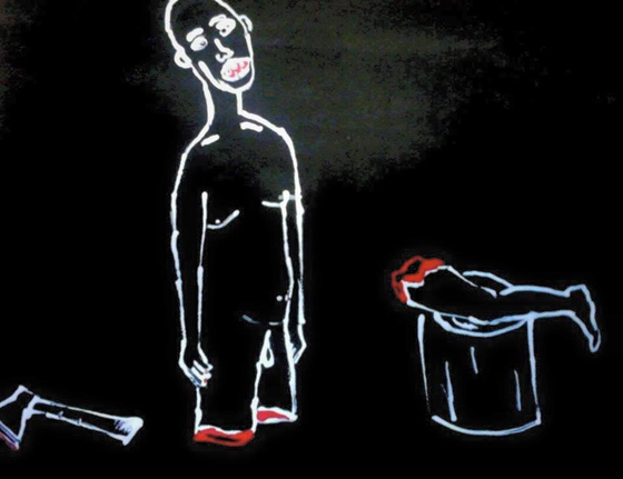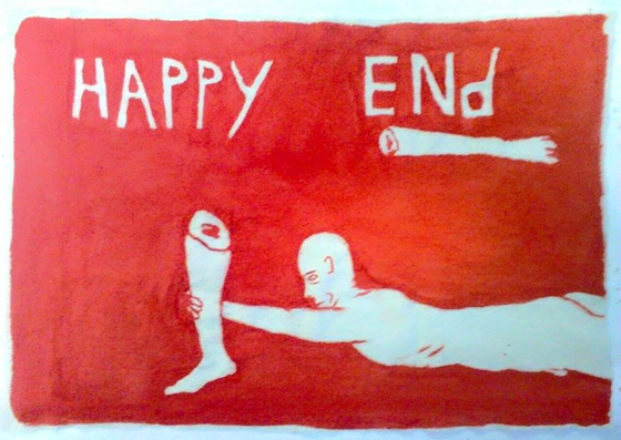 © Фейсбук Евгения Медведева Работа из серии «Самопоедание» Жесткий режим и отсутствие доступа к «допингу» принесли свои результаты — за время последней отсидки в творческом плане Ма достиг своего максимума. В тюрьме он сделал эмоциональную серию однотонных гравюрообразных работ на простынях «Самопоедание»: разрезал постельное белье на куски формата A4, грунтовал их и затем на красном или черном фоне изображал белые, искореженные в муках обнаженные фигуры с оторванными конечностями. Там же он изготовил свое наиболее коммерчески успешное произведение — толстый самодельный дневник, куда были вшиты наивные иллюстрации на крафтовой бумаге, найденные в тюремных кабинетах ненужные фотографии и документы с печатями, а также коллажи из журнальных и книжных вырезок, дополненные авторскими комментариями. Чехол был тоже сделан вручную, а страницы внутри специфически пахли испорченной тушью. Эту работу за внушительную сумму приобрел известный коллекционер из Лос-Анджелеса.