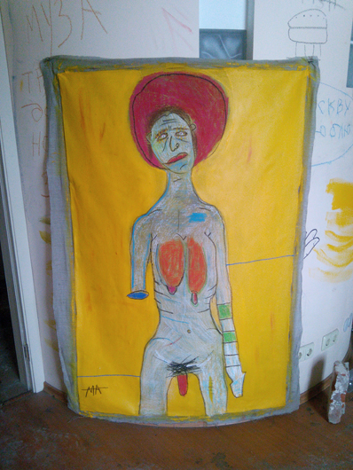© Максим Спектор Последняя работа Ма За невероятными историями выживания Медведева в столице без дома и денег можно было наблюдать в режиме реального времени по его социальным сетям — главному инструменту поиска временных пристанищ, добровольных спонсоров, потенциальных покупателей работ и сочувствующих девушек с обостренным чувством жалости. В моменты отсутствия интернета поддерживать интерес своих подписчиков Ма поручал друзьям. Один из последних постов, написанных от его имени товарищем, гласил: «Я еще жив :) <...> Очень нужны холсты, хочу рисовать!» Публикация сопровождалась фотографией Медведева (заметно похудевшего, со ссадинами на лице и взглядом побитой собаки) на фоне большого желтого холста — его последней работы. Картина с изображением бесполого человека с кривой рожицей и нимбом напоминала нечто среднее между иконой, примитивной наскальной живописью и детским рисунком. «Женя называл этот стиль “страшными картинками”, — объясняет Кирилл. — Эту картину он рисовал очень долго, все переживал, что заказчику не понравится. Но заказчику понравилось, наконец появились деньги, но пустить их пришлось уже на похороны».