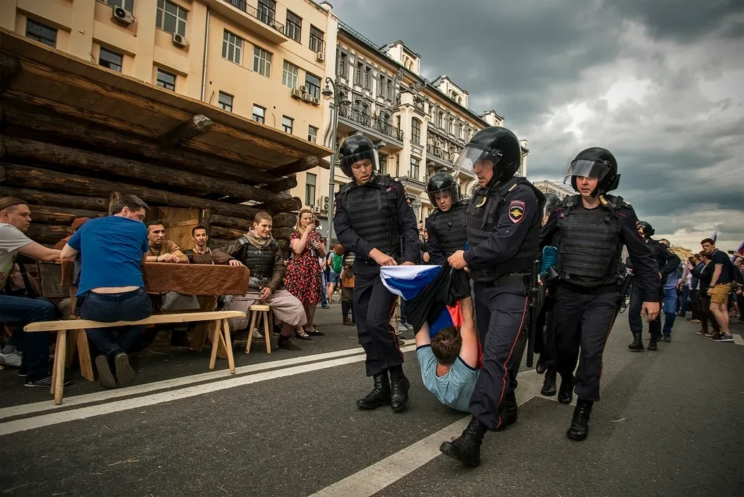 12 июня 2017 года, День России. Полиция проводит жесткое задержание участника акции против коррупции, принесшего с собой флаг России. Акцию протеста на территорию исторического фестиваля «Времена и эпохи» перенес с согласованного мэрией места политик Алексей Навальный. Всего, по последним данным, в Москве были задержаны более 850 человек. Фото: Виталий Кавтарадзе, для «Новой газеты»