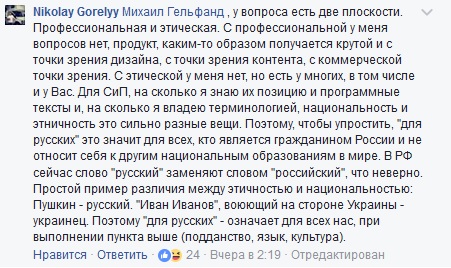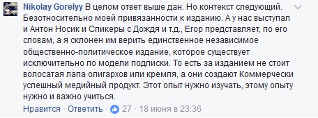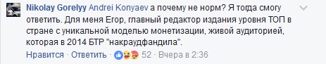 – В одном из комментариев Николая Горелова он написал, что Егор Просвирнин интересен ему как "главный редактор топ-медиа в России с живой аудиторией, которая смогла "накраудфандить" БТР в 2014 году".