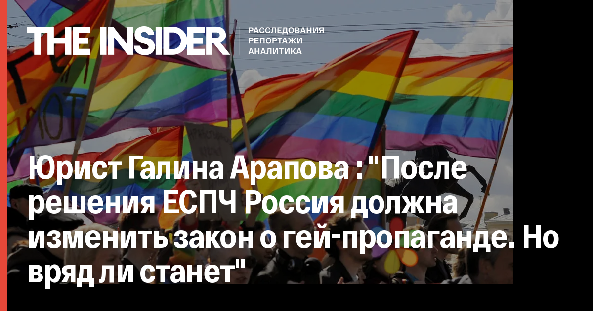 Сегодня Европейский суд по правам человека постановил, что российский закон о запрете пропаганды нетрадиционный сексуальных отношений среди детей является дискриминационным и нарушает право на свободу самовыражения. По решению суда Россия должна выплатить трем активистам ЛГБТ-движения порядка 50 тыс. евро компенсаций за нарушения их прав. Минюст России уже заявил, что будет оспаривать это решение. О том, как будут развиваться события после решения Европейского суда, и будет ли Россия пересматривать законодательство, The Insider рассказала директор Центра защиты прав СМИ Галина Арапова.