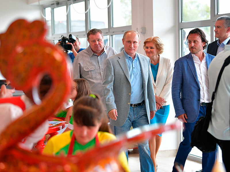 Путин прибыл в Гурзуф перед открытием смены "Улыбка Саманты" - в честь Саманты Смит, американской школьницы, гостившей в Артеке по приглашению генсека СССР Андропова. Президент осмотрел лагерь (сначала макет, а затем вживую), поел сделанных детьми блинов и пообщался с ними.