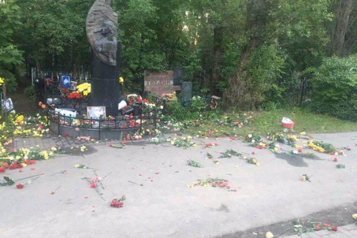 На фото видно, что вандалы разбросали вокруг могилы цветы, которые принесли к мемориалу в честь юбилея Цоя. 21 июня фанаты музыканта праздновали его 55-летие.