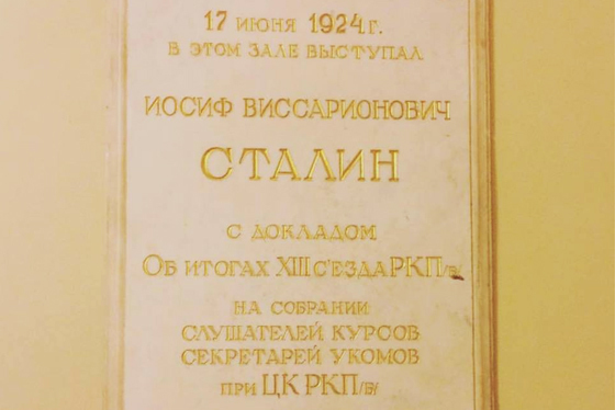 Мраморная доска с надписью о том, что в июне 1924 года «в этом зале выступал Иосиф Виссарионович Сталин с докладом об итогах XIII съезда РКП(б)», появилась на стене центральной аудитории МГЮА около недели назад, на днях о ее существовании стало известно Резнику.