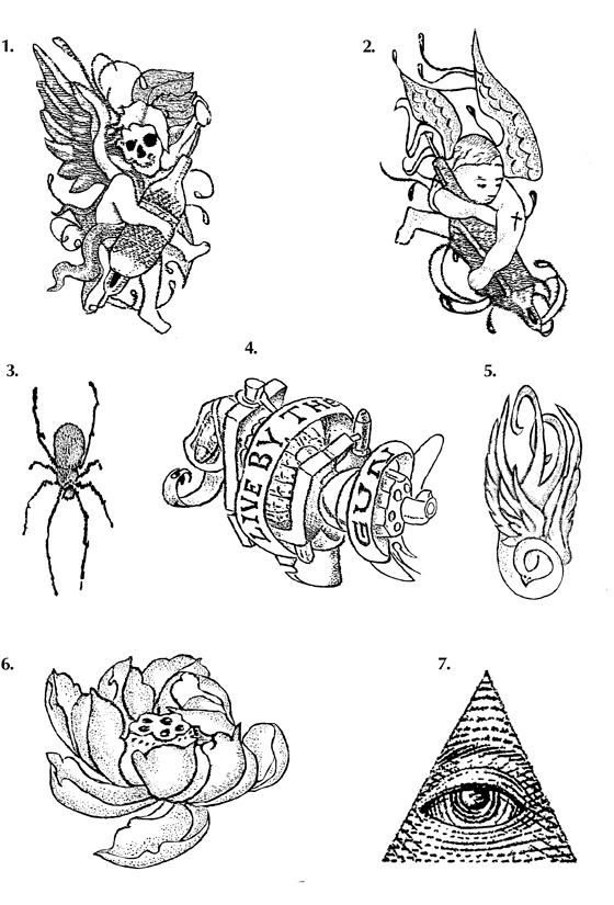 Ангел с держателем для тату-машинок и чернилами символизирует преданность профессии. Показывает желание развиваться в данной сфере.«Паук» (левая рука, кисть)