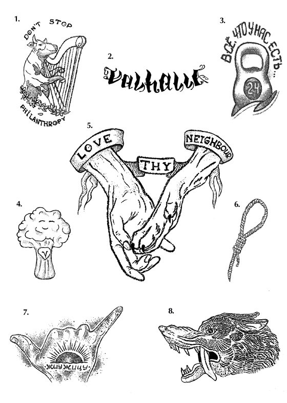 Рай для доблестных воинов, павших в бою, в германо-скандинавской мифологии.«24-килограммовая гиря. Все, что у нас есть», групповая татуировка (грудная клетка)