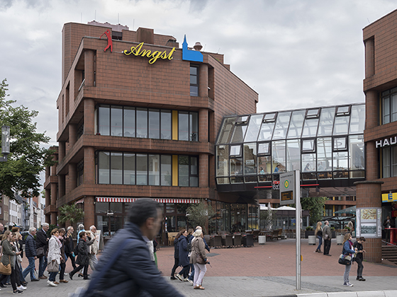 © Henning Rogge / Skulptur Projekte 2017 Козима фон Бонин + Том Бурр. Benz Bonin Burr. 2017 Напротив музея, на здании, где размещаются магазины и офисы, закреплено слово Angst («страх» или «тревога»), слева от которого замахивающийся гольфист — символ вечно взволнованного среднего класса, а справа — церковь. Это работа 1989 года Людгера Гердеса из коллекции Рурского художественного музея в Марле. Нынешнее издание «Скульптурного проекта» проходит также в этом небольшом населенном пункте в получасе езды от Мюнстера. И, в частности, оба города решили обменяться произведениями.
