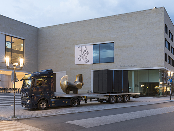 Один из самых ироничных проектов в этом году — работа Козимы фон Бонин и Тома Бурра «Benz Bonin Burr». Она представляет собой припаркованный у LWL грузовик, на котором стоит огромный черный контейнер со значком fragile — «Осторожно: хрупкое!». Впрочем, в коробке пусто. Художники предложили упаковать скульптуру Генри Мура, которая стоит на пьедестале тут же, в паре метров от машины. Им, конечно же, отказали, поскольку «святотатство», «Фонд Генри Мура на это никогда не согласится» и т.д. Желание подколоть напыщенное модернистское искусство всегда стоит приветствовать.