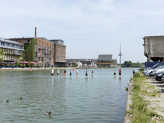 © Henning Rogge / Skulptur Projekte 2017 Эмека Огбо. Переход Мундога. Тихий шторм. 2017 А Айше Эркмен построила мост через затон, отделяющий промзону от района баров и кафе. Сам мост почти невидим и к тому же проходит на небольшой глубине под поверхностью воды. Не знаю, насколько турецкой художнице удалось поломать урбанистическую структуру Мюнстера (а она на это надеялась), но выглядит этот мост забавно.