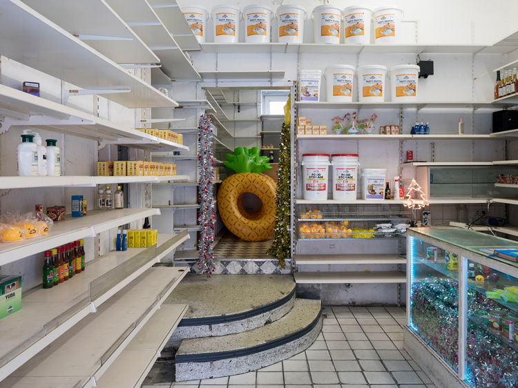 © Henning Rogge / Skulptur Projekte 2017 Бенджамин де Бурка, Барбара Вагнер. Прощай, прощай, Германия! Мелодия любви. 2017 Еще один фильм, на этот раз в духе магического реализма, демонстрируется в магазине продукции из Азии. В самом торговом пространстве на полках лежат котики Hello Kitty, надувные круги в виде ананаса, керамические слоники, всякие экзотические соусы и мишура. А в глубине (видимо, в подсобке) показывается видео Мики Роттенберг — история про то, как люди попадают в иные миры через кастрюлю уличной торговки.