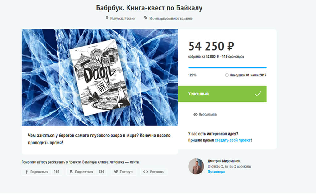 «Нужно поверить и проверить проект! Людям нужно почувствовать, что они являются частью чего-то большего, что их деньги пойдут на достижение высокой цели. Используйте таргентированную рекламу. На случай того, если проект не пройдет, то подключайте партнеров к своей идеи». Дмитрий Мироманов руководитель проект книги-квеста по Байкалу «Бабр-бук»