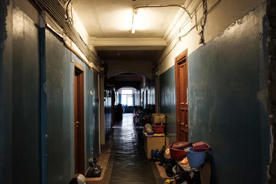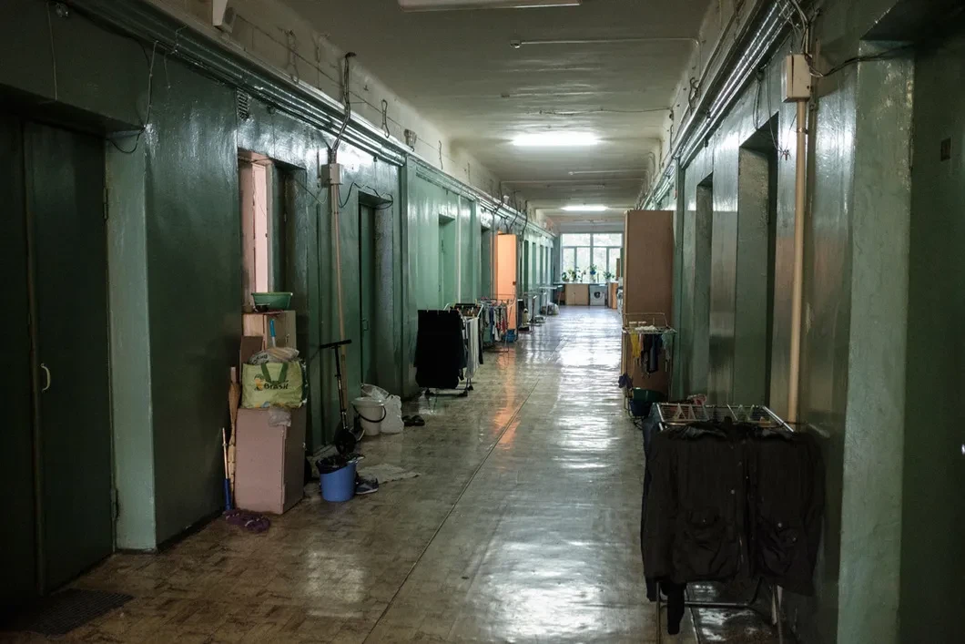 «Год назад, 11 июня, к нам сюда приехал ОМОН с автоматами. А вместе с ним фуры, чтобы выбрасывать наши вещи на улицу», — Елена Чернецкая, многодетная мать и один из главных в общежитии активистов, ведет нас через полутемный, узкий, уставленный детскими велосипедами коридор.