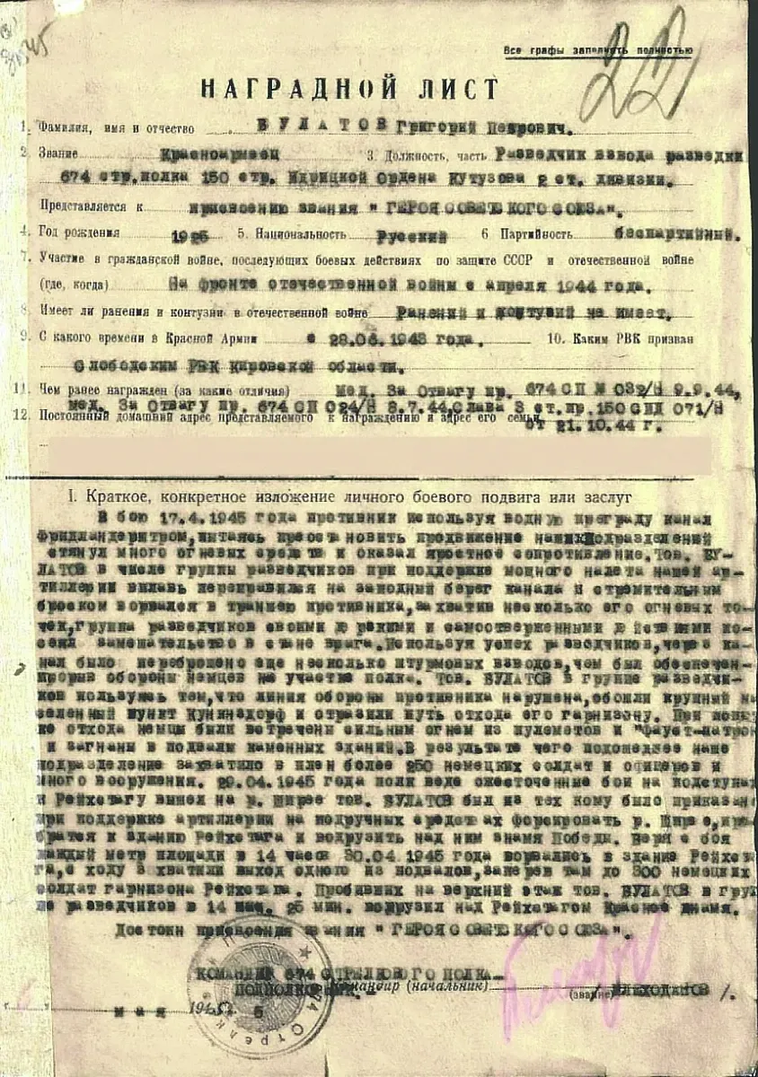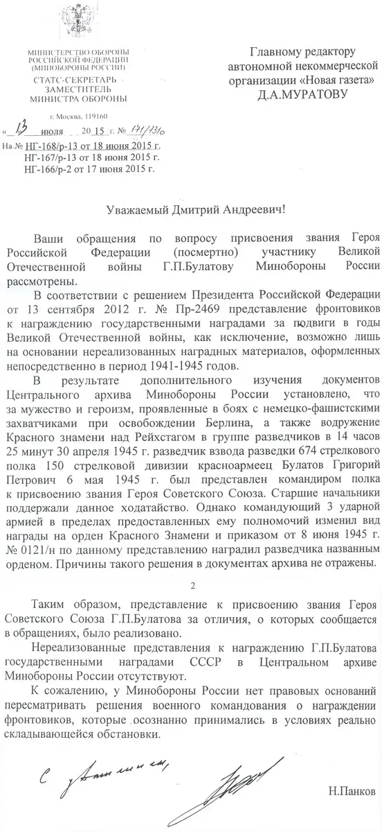 То есть герою вновь отказали в признании, ссылаясь на формальные основания. В распоряжении «Новой газеты» есть другой документ — официальное письмо начальника Института военной истории Минобороны РФ Александра Кольтюкова, кандидата военных наук, в котором говорится: «Приказом командующего войсками 3-й ударной армии 1-го Белорусского фронта № 012-н от 8.6.1945 года Булатов Г.П. от имени Президиума Верховного Совета СССР был награжден орденом Красного Знамени за образцовое выполнение боевых заданий на фронте борьбы с немецкими захватчиками и проявленные при этом доблесть и мужество». Упоминаний о водружении Знамени Победы над Рейхстагом в приказе о награждении Булатова орденом Красного Знамени нет.