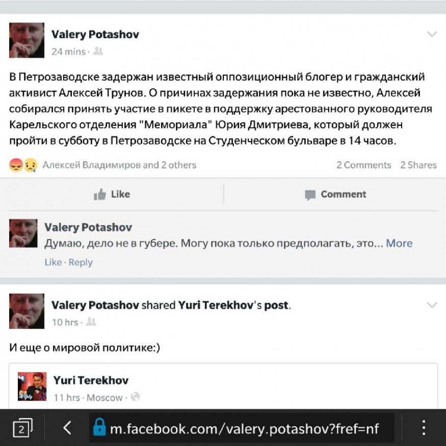 — Его задержали на выходе из школы, где он работает сторожем. По словам Алексея, он видел, что машина у ворот школы стояла всю ночь, и предполагал, что ждут именно его. Сначала у него спросили паспорт, и когда выяснилось, что документа с собой нет, доставили в полицию для выяснения личности. Но после того, как паспорт привезли в полицию, выяснилось, что он там особо никому не нужен. В сумке у Трунова обнаружили листовки к сегодняшнему пикету в поддержку Юрия Дмитриева, а также листовки Алексея Навального. И в тех, и в других нет ничего запрещенного, все законно. Сейчас Трунову ищут адвоката, но связи с ним пока нет.