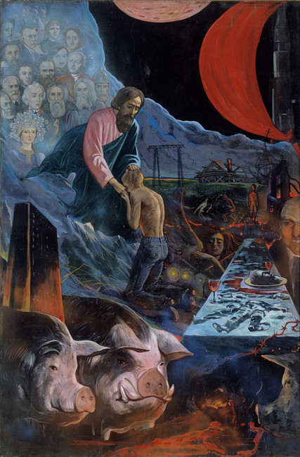 И все-таки главной картиной Глазунова останется «Возвращения блудного сына» (1977), на который мальчик в джинсах припадает к рукам русского святого. Рано или поздно русские откажутся от всех новомодных западных течений (в том числе и марксизма) и начнут строить «историческую Россию», — однозначно считывали посыл картины современники.