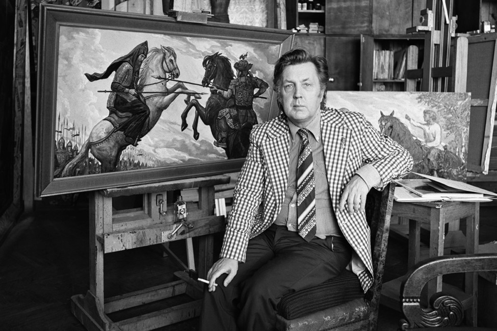 Илья Глазунов у своей работы «Поединок Пересвета с татарским богатырем», 1980 год. Фото: Мастюков Валентин / Фотохроника ТАСС