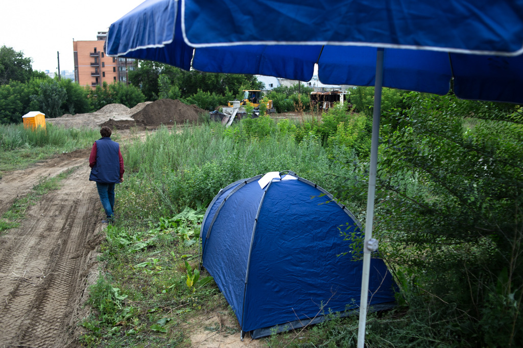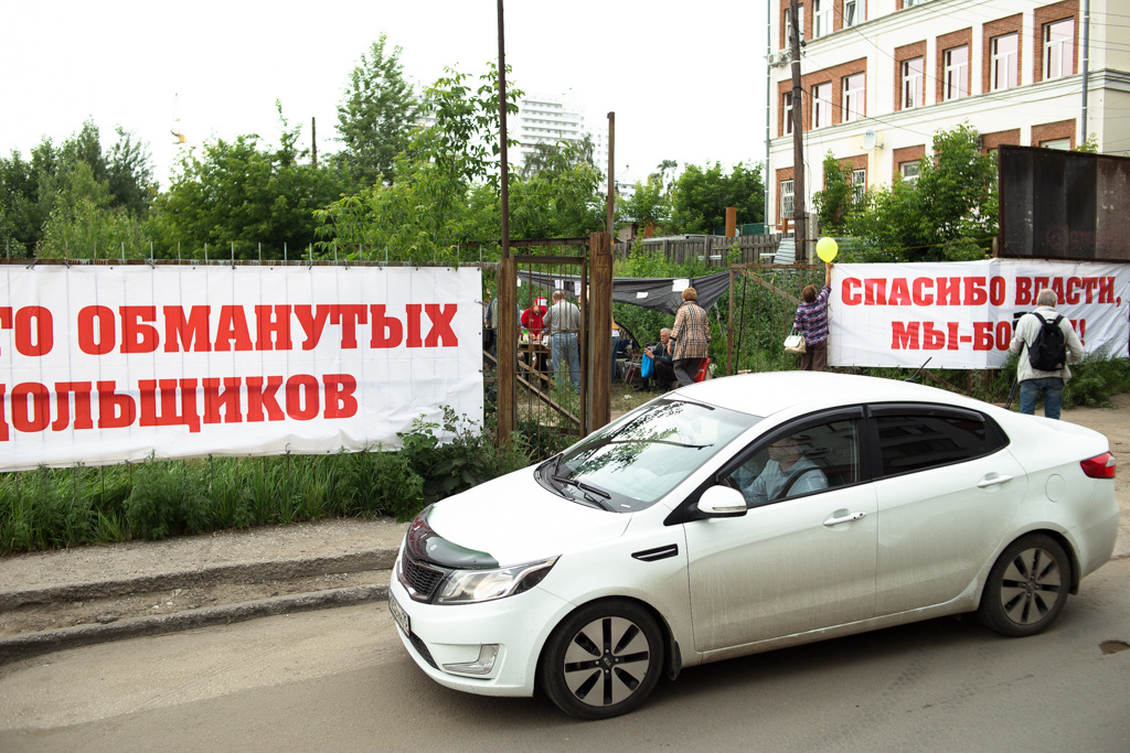 Дольщики поставили палатки у долгостроя на улице Зыряновская. На них наклеили номера купленных квартир. Участники также растянули баннеры со словами «Гетто обманутых дольщиков» и «Спасибо власти, мы — бомжи!», передает корреспондент Тайги.инфо 10 июля.