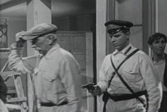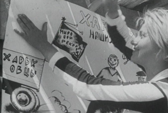 © Мосфильм «Время, вперед!» хочет казаться достоверным изображением эпохи первых пятилеток — не случайно фильм начинается с выпуска киножурнала «Совкино»: Ворошилов командует парадом на Красной площади, в Ленинграде — живой Горький, в Москве — мертвый Маяковский, в Нью-Йорке полиция разгоняет рабочую демонстрацию. Все это — под музыку Георгия Свиридова, знакомую современному зрителю по выпускам программы «Время». Псевдохроникальные кадры со стройки, на которых девушка в полосатой майке прикрепляет к стене плакат с цитатой из Маяковского — «Шагай, страна, быстрей, моя, коммуна — у ворот! Вперед, время! Время, вперед!», — вполне вписываются в круг этих сюжетов.
