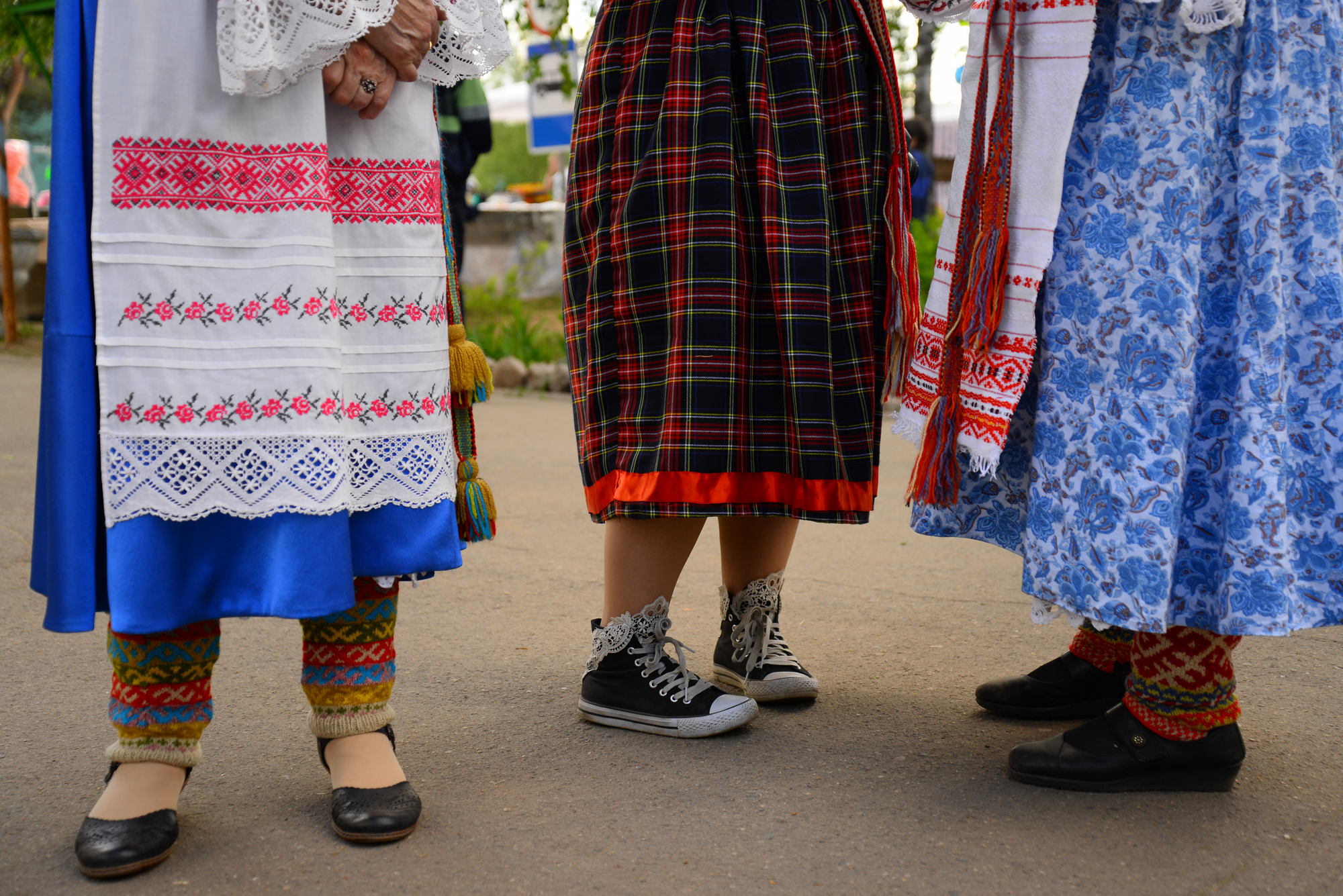 Среди пар с колясками, детей со сладкой ватой и пожилых людей прогуливаются женщины в народных костюмах — просторных платьях в пол, передниках с вышивкой и красных головных уборах.