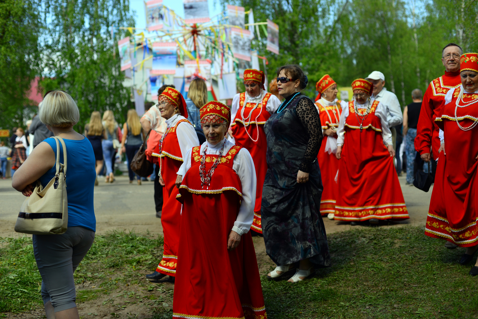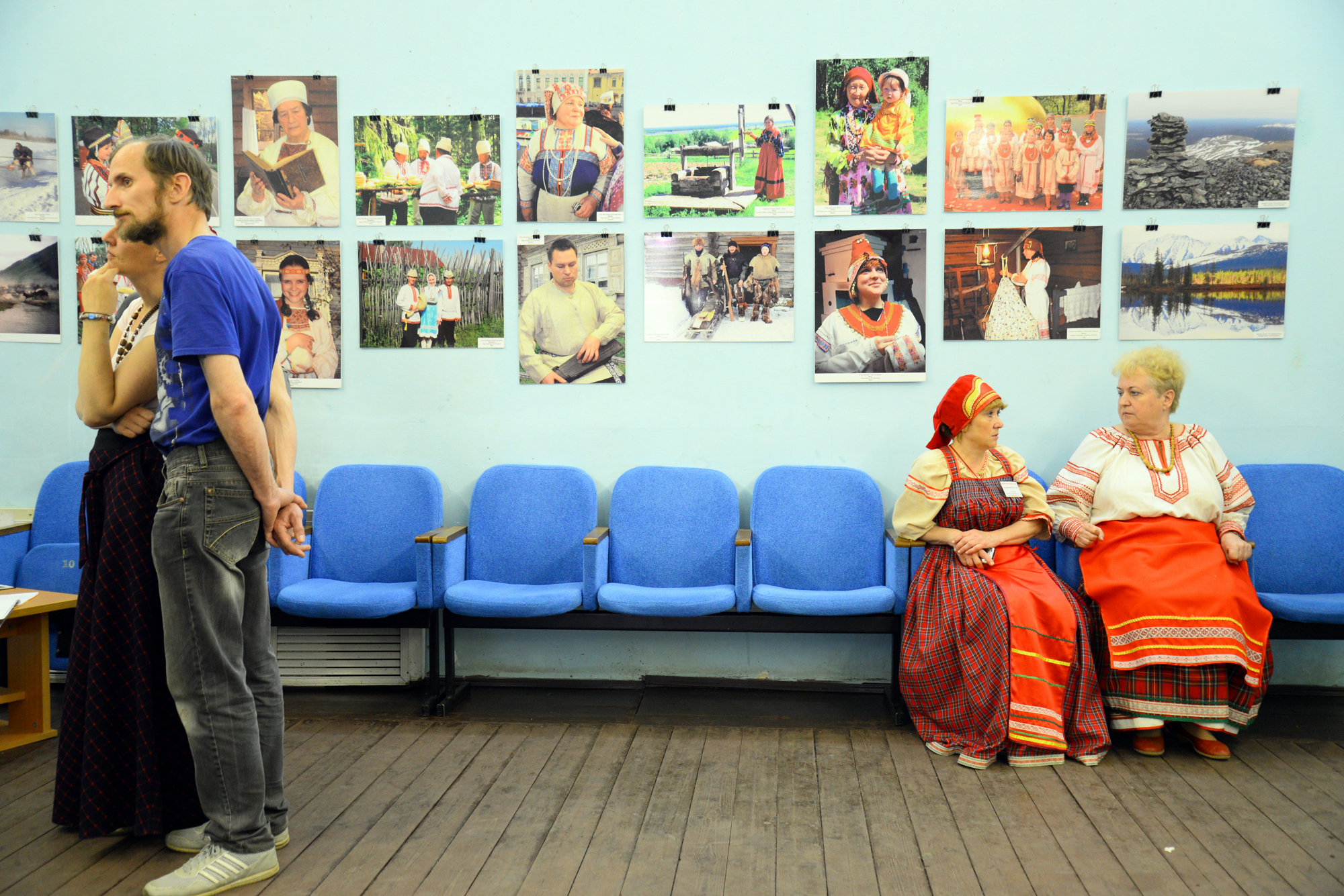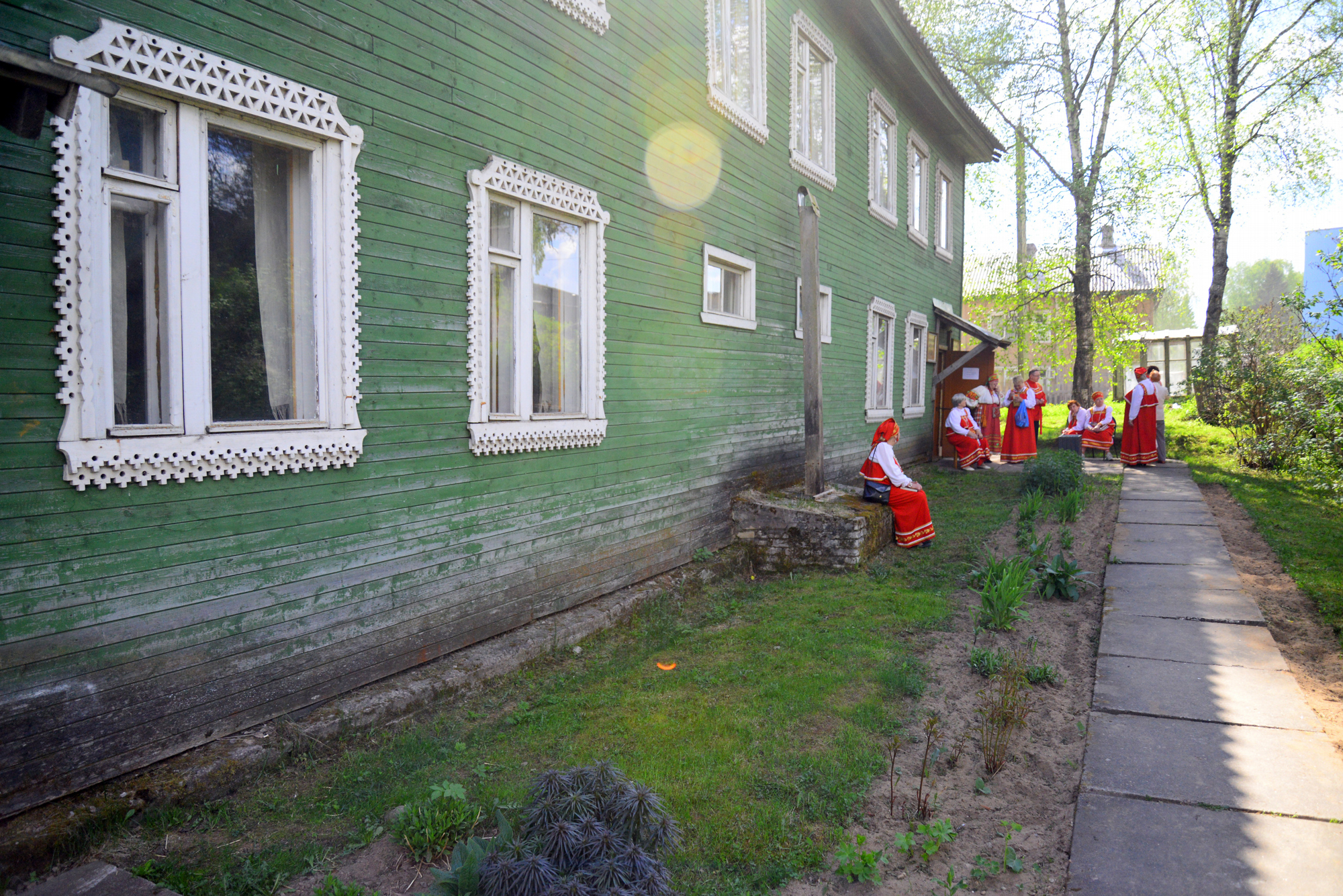 Перед Вепсским центром отдыхают фольклорные ансамбли, среди которых неожиданно встречаются певцы с острова Таймыр — в расшитых мехом длинных кафтанах, несмотря на теплую погоду.