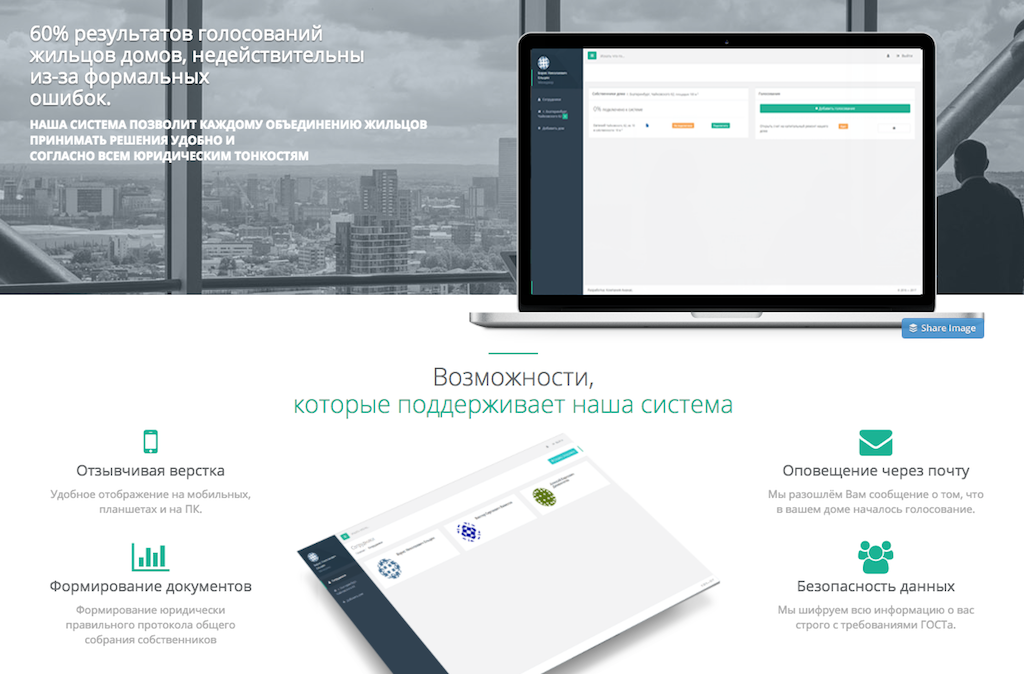Реальность такова, что большинство результатов голосований собственников жилья считаются недействительными из-за неграмотно составленных протоколов голосований. Цель проекта исправить эту ситуацию с помощью удобного интерфейса и корректных, юридически грамотных шаблонов протоколов.