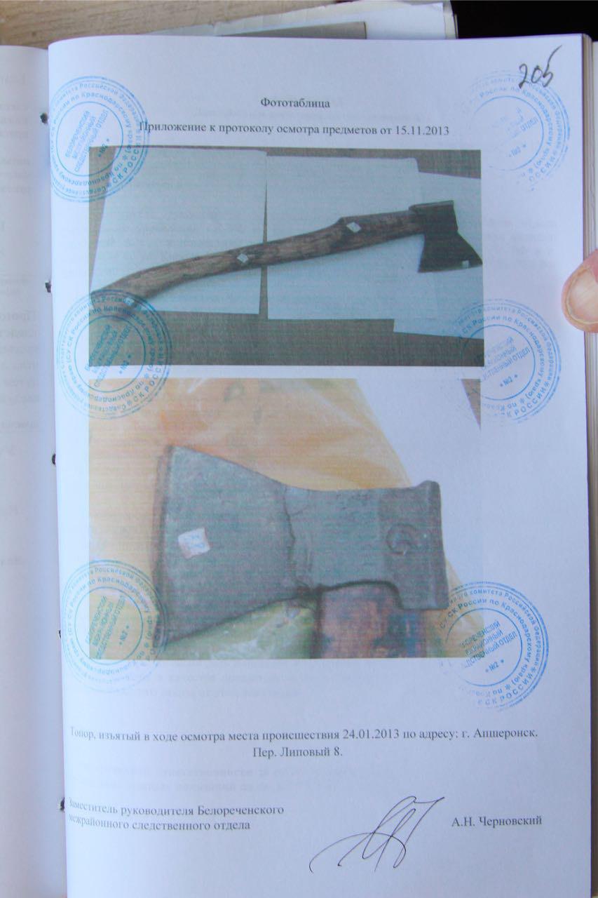 Николай. [Приехали вскоре после убийства в краевое управление СК] c пачкой фотографий. Кладем на стол начальнику, высказываем ему все подозрения, что этому сопутствовали. Он посмотрел, вызывает своих сотрудников и говорит: «Ваше мнение?». Все говорят, что да, тут же явное убийство умышленное. И он тогда взял телефон, позвонил начальнику [апшеронского] Следственного отдела: «Вы чем там занимаетесь, вы почему человеку не даете экспертизу? Направляйте его на экспертизу в Краснодар». И нам ее дали. А уже тогда по апшеронскому нашему местному телевидению прошел сюжет, что бомж-наркоман ворвался, и прочее, и прочее, когда я как отец знаю своего сына, что он на это не способен, он порядочный человек. Но его имя уже тогда опорочили: на бедных стариков напал с целью грабежа. Вот почему я не стал его хоронить.