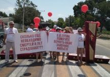 Протестующие установили на пешеходном переходе два гроба. По словам членов инициативной группы, они символизируют жертвы дома на Красногвардейской. Участники акции держали плакаты "Мэр Хрестин отбирает наше жилье", "Путин, помогите вернуть наше законное жилье". Около 10 минут федеральная трасса оставалась перекрыта, еще полчаса участники акции частично блокировали проезд, выстроившись в линию на переходе и пропуская машины только по обочинам. На трассе образовалась многокилометровая пробка.