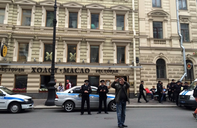 В воскресенье, 16 июля, на пешеходном участке Большой Морской улицы у арки Главного штаба собралась разнообразная публика. На акцию «Весны» пришли представители «Артподготовки» во главе с Александром Расторгуевым, координатор «Открытой России» Андрей Пивоваров, ЛГБТ-активисты и около трех десятков журналистов. Небольшая толпа то и дело прирастала любопытствующими туристами и горожанами, а вокруг бродили аниматоры в ростовых куклах мультяшных зверей.
