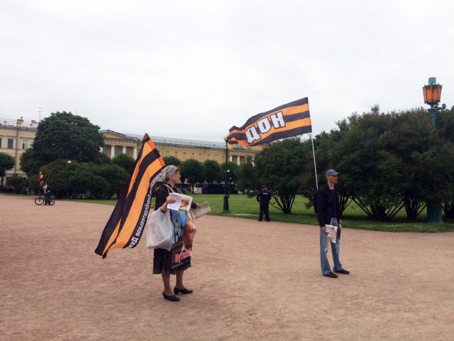 Марсово поле, несмотря на выходной день, необычно пустовало. В центре рассредоточились трое пикетчиков НОДа с флагами и газетами и двое полицейских. Активисты «Весны», пообщавшись с полицией, сфотографировались на фоне нодовцев и ушли.