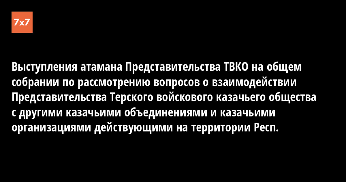 Выступления атамана Представительства ТВКО на общем собрании по рассмотрению вопросов о взаимодействии Представительства Терского войскового казачьего общества с другими казачьими объединениями и казачьими организациями действующими на территории Респ.