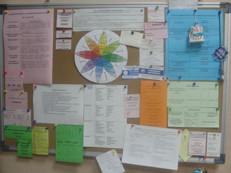 Доска с рабочей информацией: круг эмоций (в центре); база разных служб помощи (внизу справа); подсказки, составленные телефонистами по вопросам суициденту (внизу слева)Фото: Виктория Микиша Бывает, что звонят люди, которые сделали что-то социально неодобряемое. Вот моей коллеге звонил мужчина, и он убил бомжа. Его совесть мучает, но он боится обратиться в полицию и жить с этим не может. И тогда мы спрашиваем: «А как вы будете с этим дальше жить? Вы сможете?», но мы не говорим: «Плохо ты поступил, иди сдавайся!» и сами заявить на него не можем, потому что есть правило конфиденциальности. Он тогда решил пойти в полицию, хотя и мог сказать «Да я потерплю!» У меня, конечно, есть ощущение: «Блин, чувак, ты неправильно поступил!», но осуждение — это не единственное мое чувство. Потому что за каждым таким поступком стоит история: почему он так поступил? Что с ним произошло, что привело к этому? И я спрашиваю, он рассказывает, и там всплывает целый ряд событий, которые его к этому привели. Какое право я имею его осуждать?