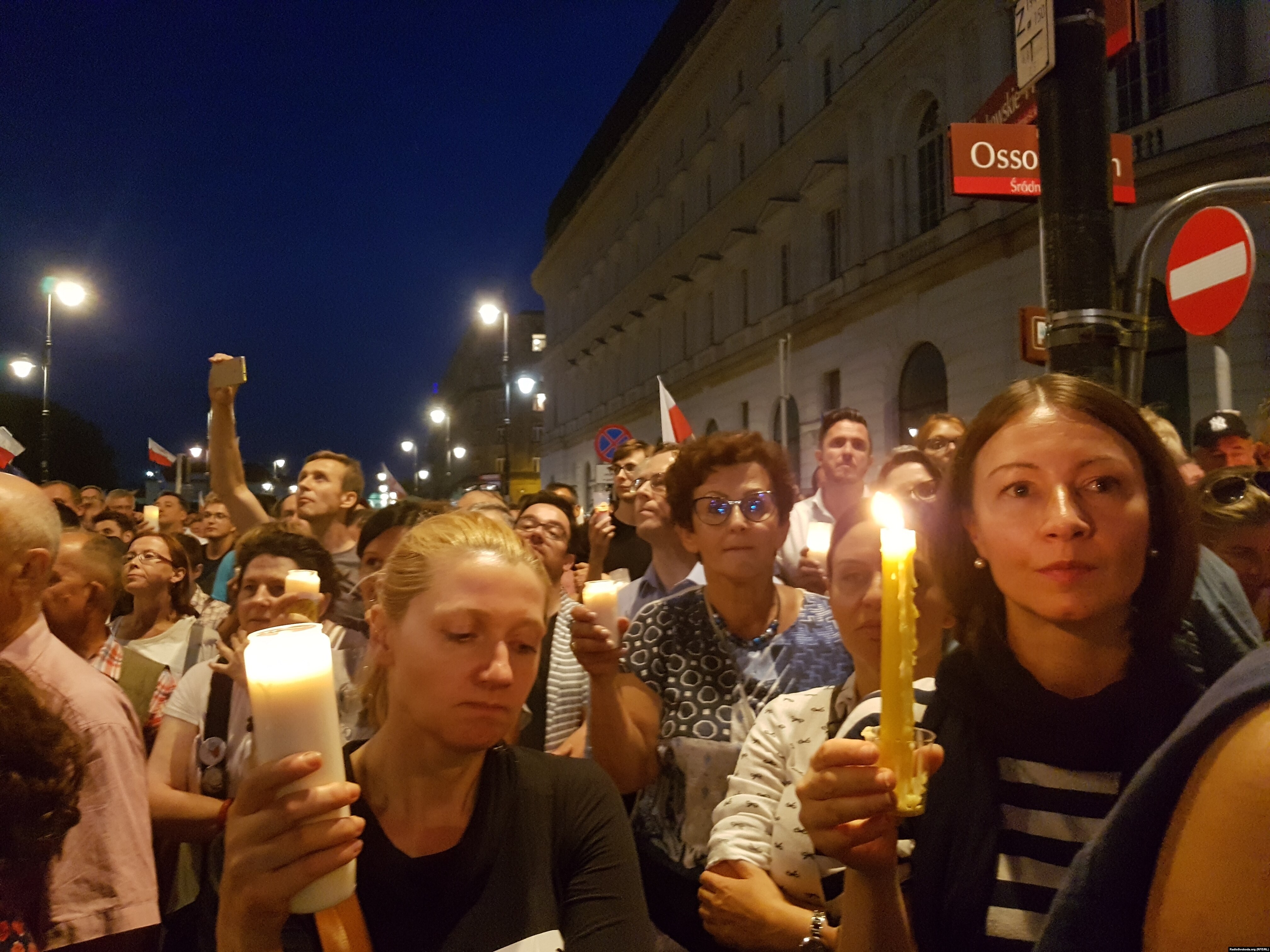 Тысячи протестующих собрались в Варшаве, Кракове и других городах, чтобы призвать Дуду отказаться от законодательства. Многие из протестующих пришли к Верховному суду, где люди держали свечи и пели песню Джона Леннона "Представьте себе".