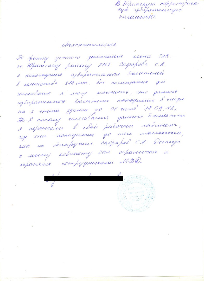 Председатель УИК № 523 госпожа Овсянникова Т.Ю., после долгих переговоров по телефону с неизвестным абонентом, всё же созналась в содеянном, о чем и написала собственноручно «Объяснение», в котором дала пояснение, что данные бюллетени были изъяты ею ещё до начала голосования. Цель этого своего деяния она пояснить отказалась.
